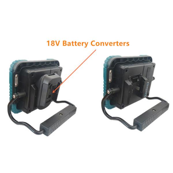 Besides the current 18V Makita batteries, by the special converters, this rechargeable work light also can be powered by Metabo, Stanley, Porter Cable, DeWalt, Milwaukee, and Bosch 18V power tools batteries.